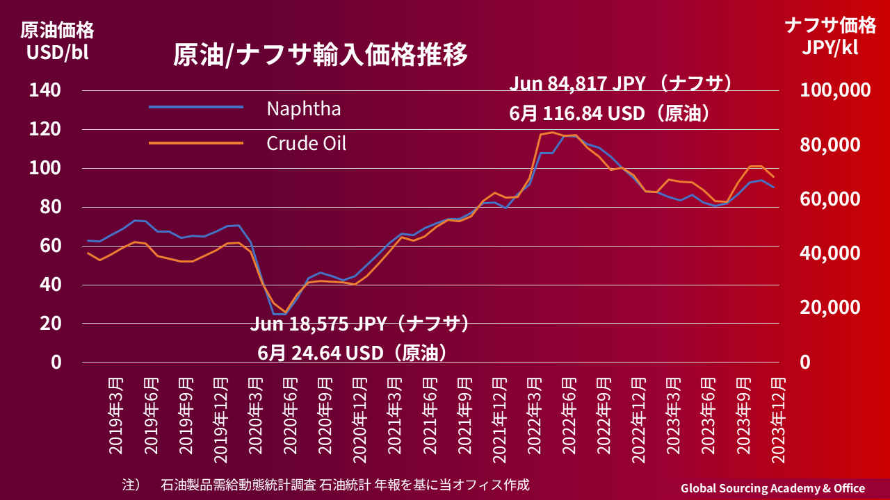 - ナフサ及び原油価格の高騰化ピーク値