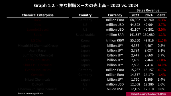 - 左図は、主だったプラスティック樹脂メーカ(中国除く)売上高 - 2023 vs. 2024